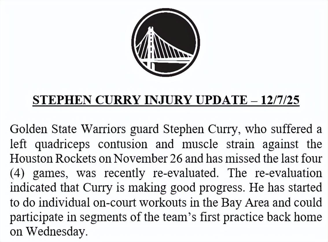 官方公告写道:金州勇士后卫斯蒂芬-库里于11月27日(北京时间,下同)对阵休斯顿火箭的比赛中遭遇左股四头肌挫伤及肌肉拉伤,此后已缺阵4场赛事。球队近期对其伤情进行了复查,结果显示库里恢复情况良好。他已在湾区开启个人场内训练,有望在周四球队回到主场后的首堂训练课中参与部分环节。