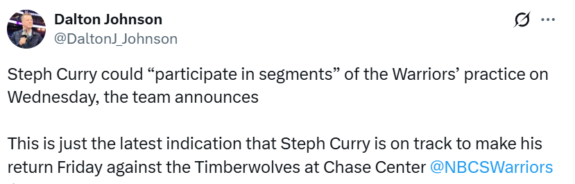 队记Dalton Johnson转发了勇士的公告,并表示这进一步表明库里有望在本周六主场对森林狼的比赛中复出。